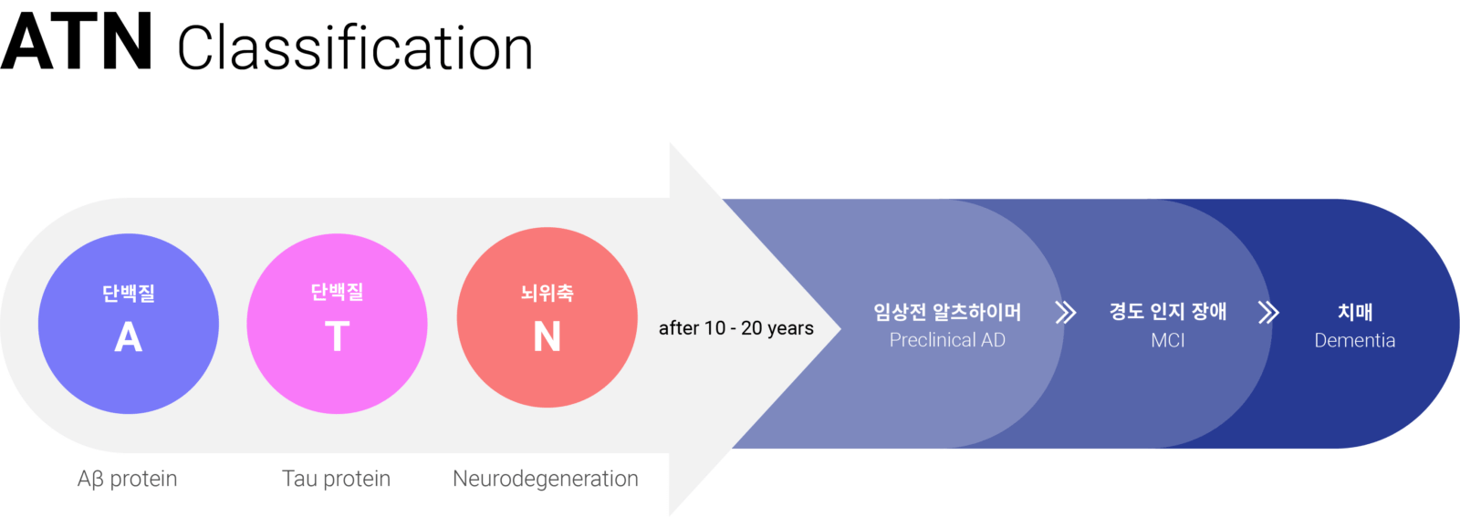 치매의 70%에 해당하는 알츠하이머형 치매는 발병 10여년 전부터 뇌 속에 병변(ATN: Amyloid Beta, Tau, Neurodegeneration)이 쌓이기 시작하므로 조기 진단을 통해 질병의 예방 혹은 발병의 지연이 충분히 가능한 질환입니다. 현재 진료 체계에서 인지기능 저하가 발생하여 병원을 방문하고 치매를 진단받는 순간은 이미 뇌 위축까지 발생한 이후입니다.