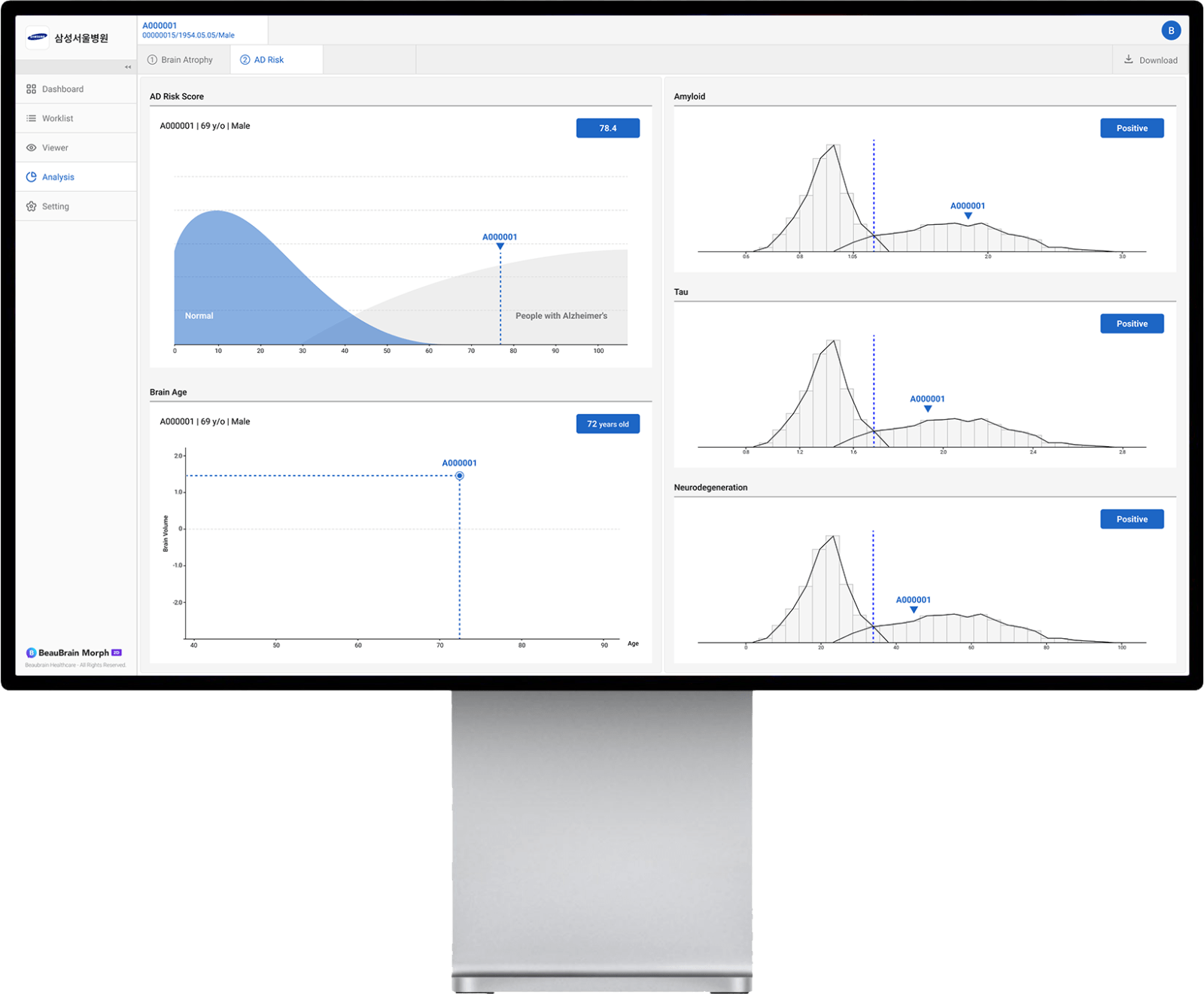 뇌 2D MRI 영상을 이용하여 뇌 위축을 정량화 하고, Amyloid와 Tau의 양성률 예측 및 치매 위험지수, 예후, 뇌 연령 등을 예측하는 딥러닝 기반 분석 소프트웨어입니다.