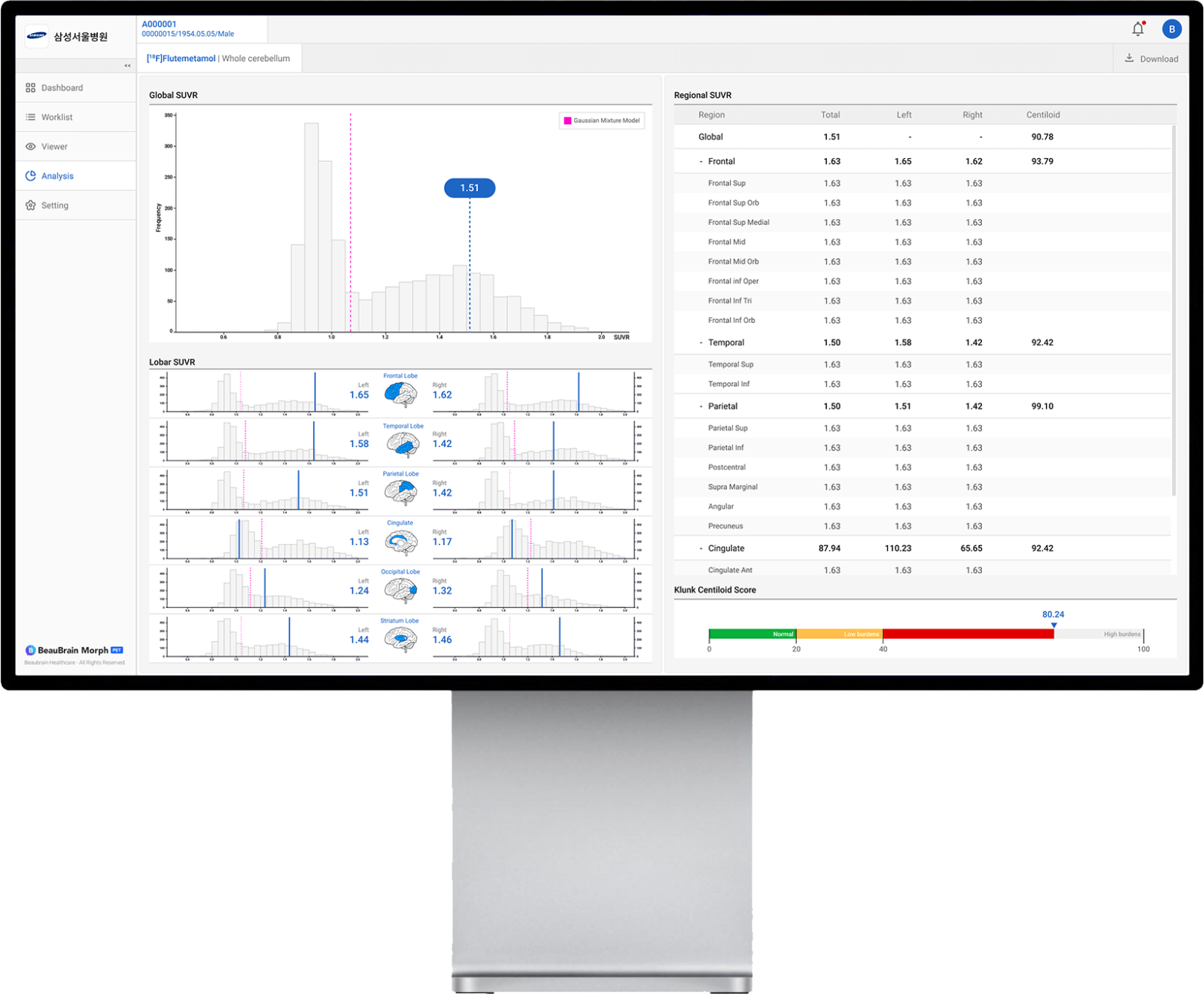 PET-CT 또는 PET-3D T1 MRI 영상을 사용하여 방사성 추적자로 표식된 뇌 영상의 바이오마커를 SUVR*, Centiloid*로 정량 분석하는 소프트웨어입니다.